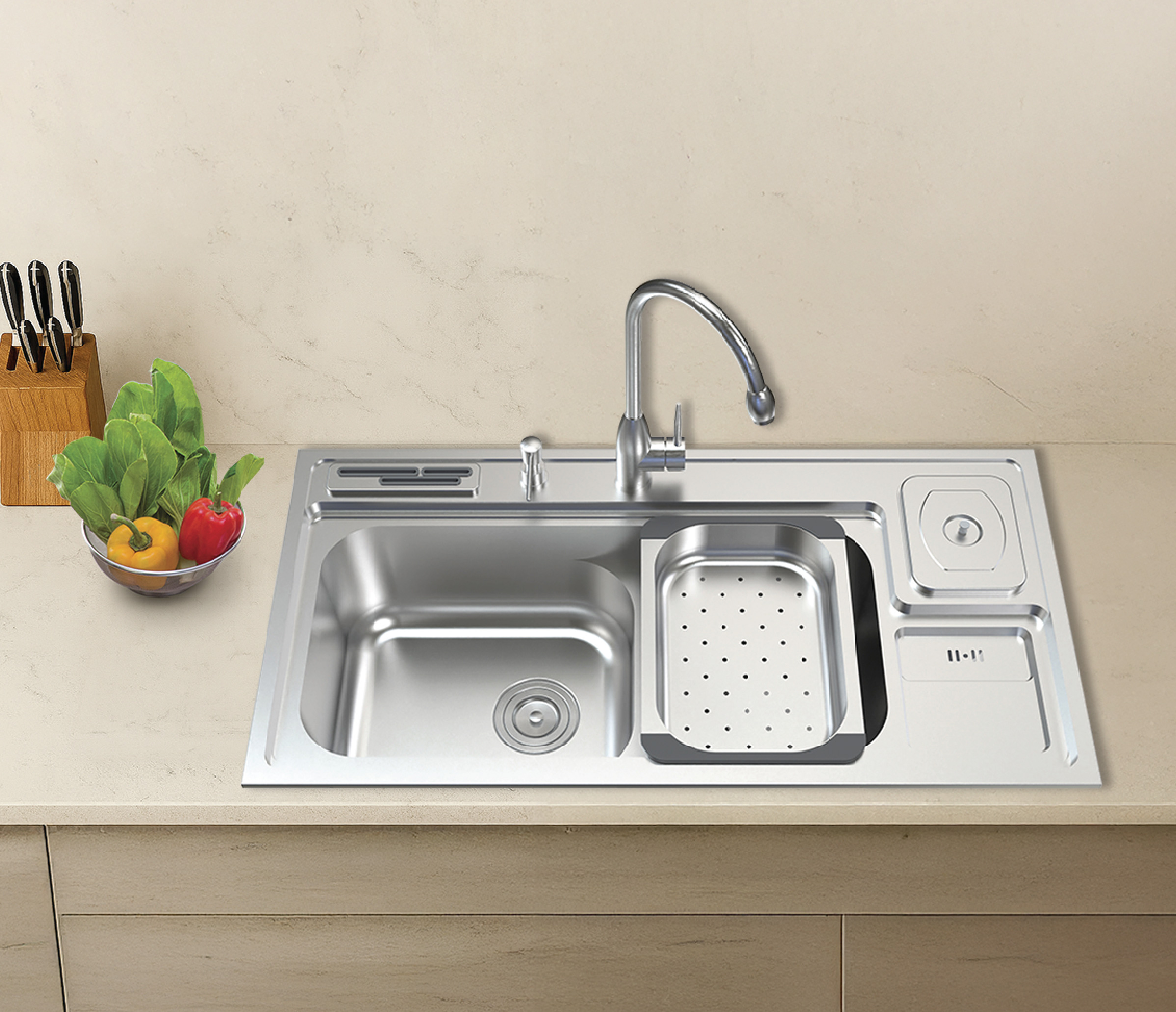 AISI 304 Grade Steel : Exceptional durability and rust resistance ensure a hygienic, long-lasting, and stylish sink that stands the test of time. Dual Sound Absorption: High-quality, sound-deadening pads dramatically reduce noise and vibrations, making your sink exceptionally quiet for a more peaceful kitchen. Multipurpose Accessories: Integrated accessories transform your sink into a versatile workstation which includes Colander, Knife Box, Faucet, Soap Dispenser, Bottle trap connector. Clean Drain Coupling: Our sink's coupling includes a small basket to filter food waste, making your washing process more hygienic and cleanup effortless.