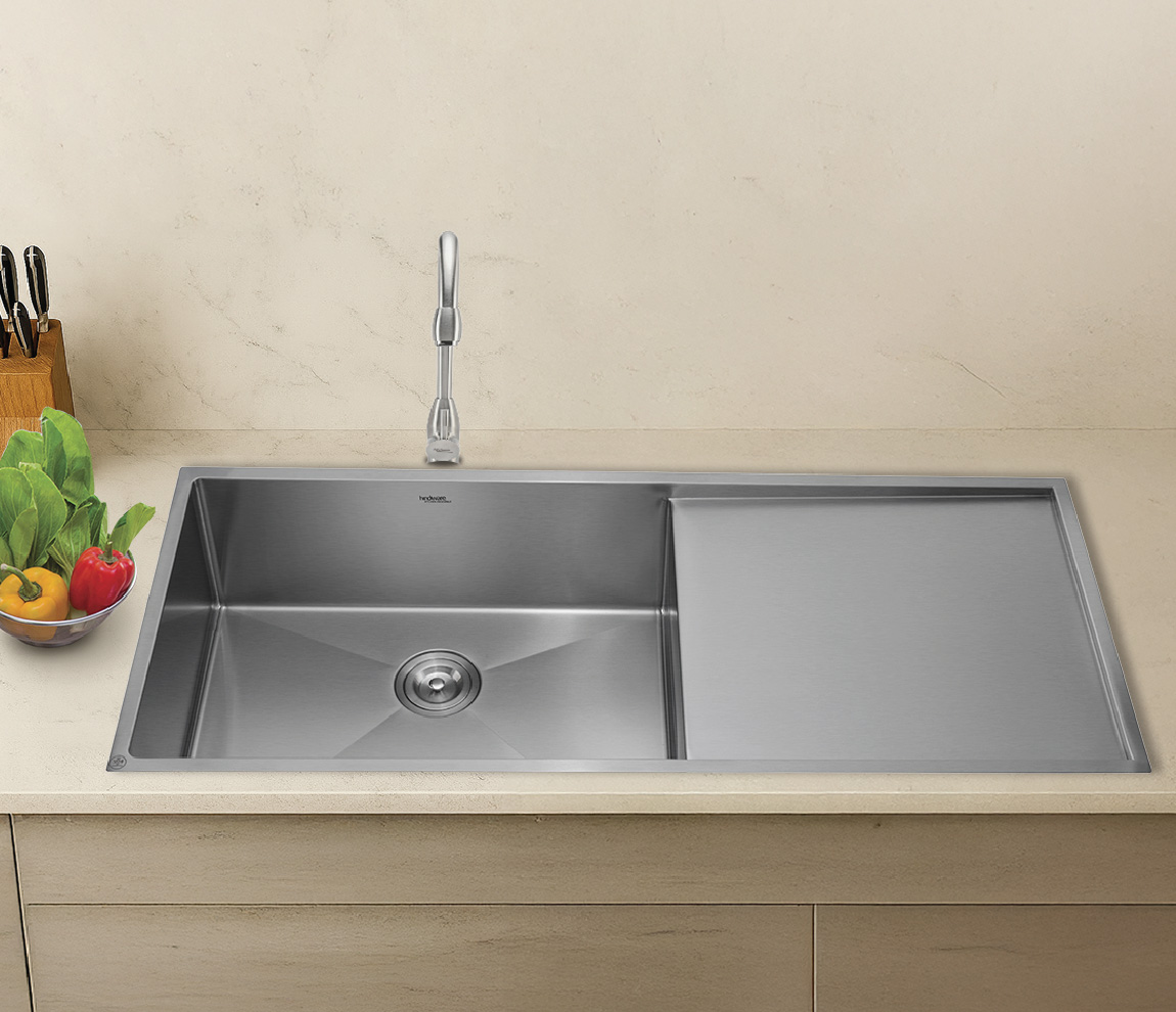 Crafted by artisans, these sinks are a unique, custom product with a higher level of craftsmanship. AISI 304 Grade Steel: Exceptional durability and rust resistance for a hygienic, long-lasting, and stylish sink. Dual Sound Absorption: High-quality, sound-deadening pads reduce noise and vibrations for a more peaceful kitchen. Clean Drain Coupling: A small basket filters food waste, making your washing process more hygienic and cleanup effortless. Radius 10 Curve: R10 corners prevent waste from settling, ensuring easy and hygienic cleaning. Matt Finish A subtle and sophisticated look, perfect for a modern, minimalist kitchen aesthetic.