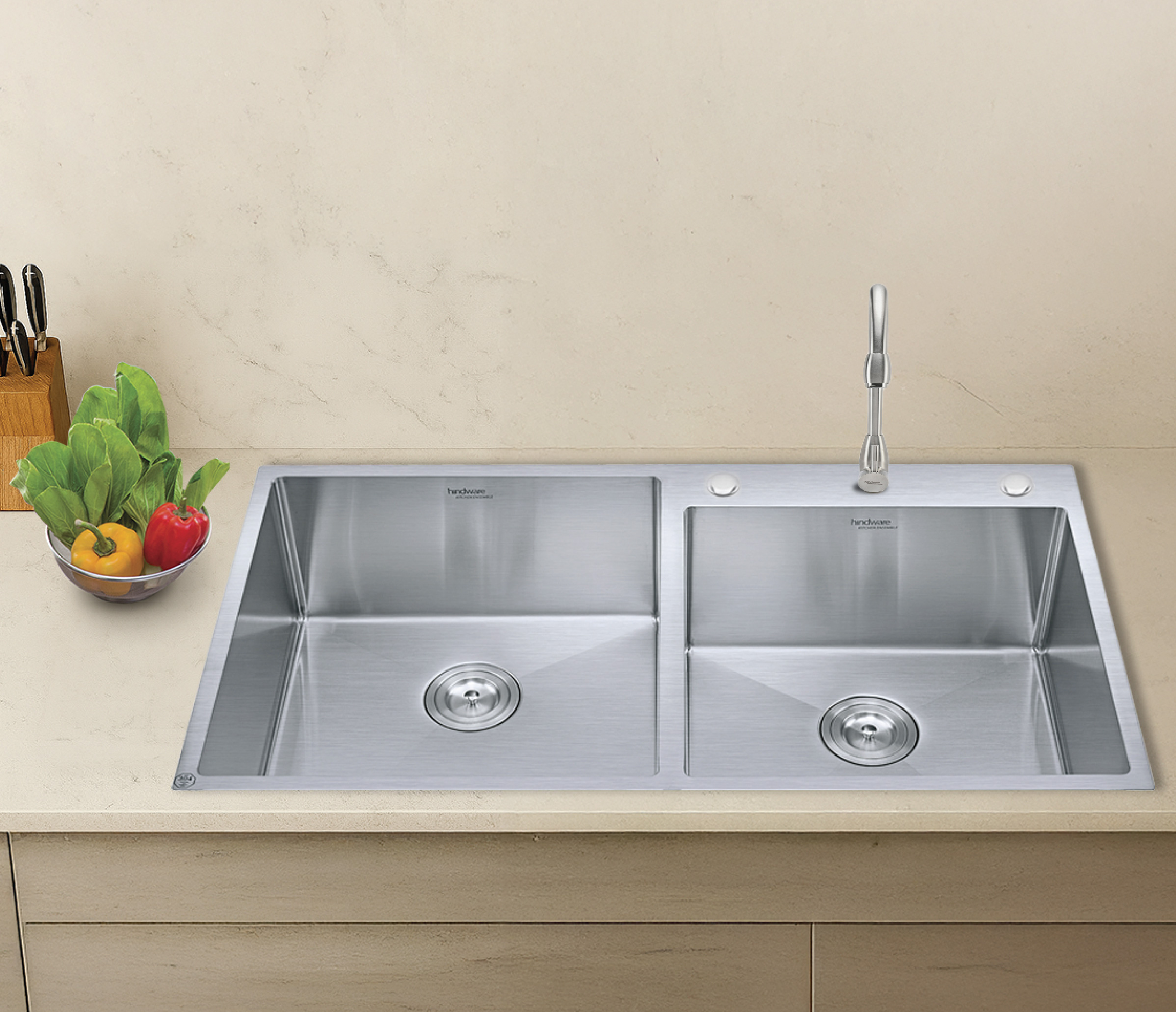 Crafted by artisans, these sinks are a unique, custom product with a higher level of craftsmanship. AISI 304 Grade Steel: Exceptional durability and rust resistance for a hygienic, long-lasting, and stylish sink. Dual Sound Absorption: High-quality, sound-deadening pads reduce noise and vibrations for a more peaceful kitchen. Clean Drain Coupling: A small basket filters food waste, making your washing process more hygienic and cleanup effortless. Radius 10 Curve: R10 corners prevent waste from settling, ensuring easy and hygienic cleaning. Matt Finish A subtle and sophisticated look, perfect for a modern, minimalist kitchen aesthetic.