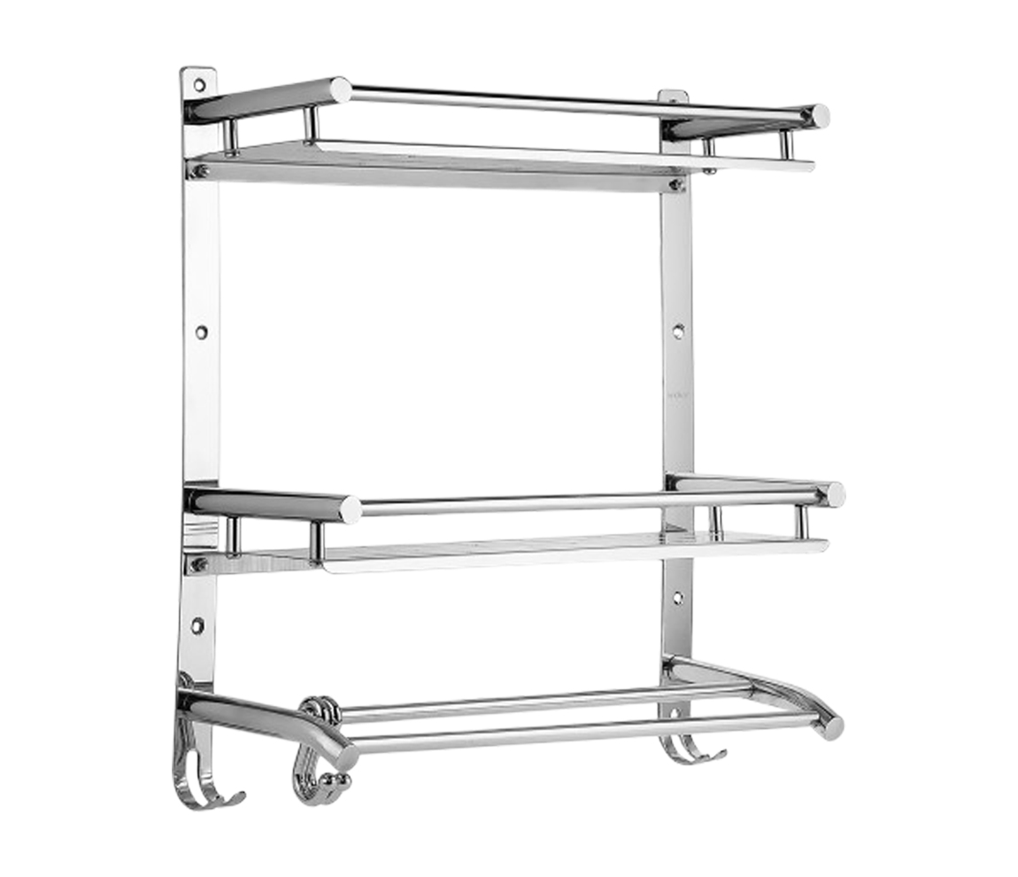 Add neat, vertical storage with Hindware Italian Collection Multipurpose 3 Layers Shelf — a wall-mounted organizer that keeps daily essentials visible, dry, and within easy reach. • Triple-Shelf Capacity with hooks : Three spacious shelves plus utility hooks help sort bottles, soaps, and accessories without clutter. • Space-saving size : Compact footprint (approx. 12 D × 30 W × 40 H cm) fits comfortably beside mirrors or above basins. • Stainless-steel build : Heavy-duty construction resists everyday humidity while the polished finish keeps the look crisp. • Easy wall mount : Designed for quick installation; mounting hardware is included for a clean, secure setup.