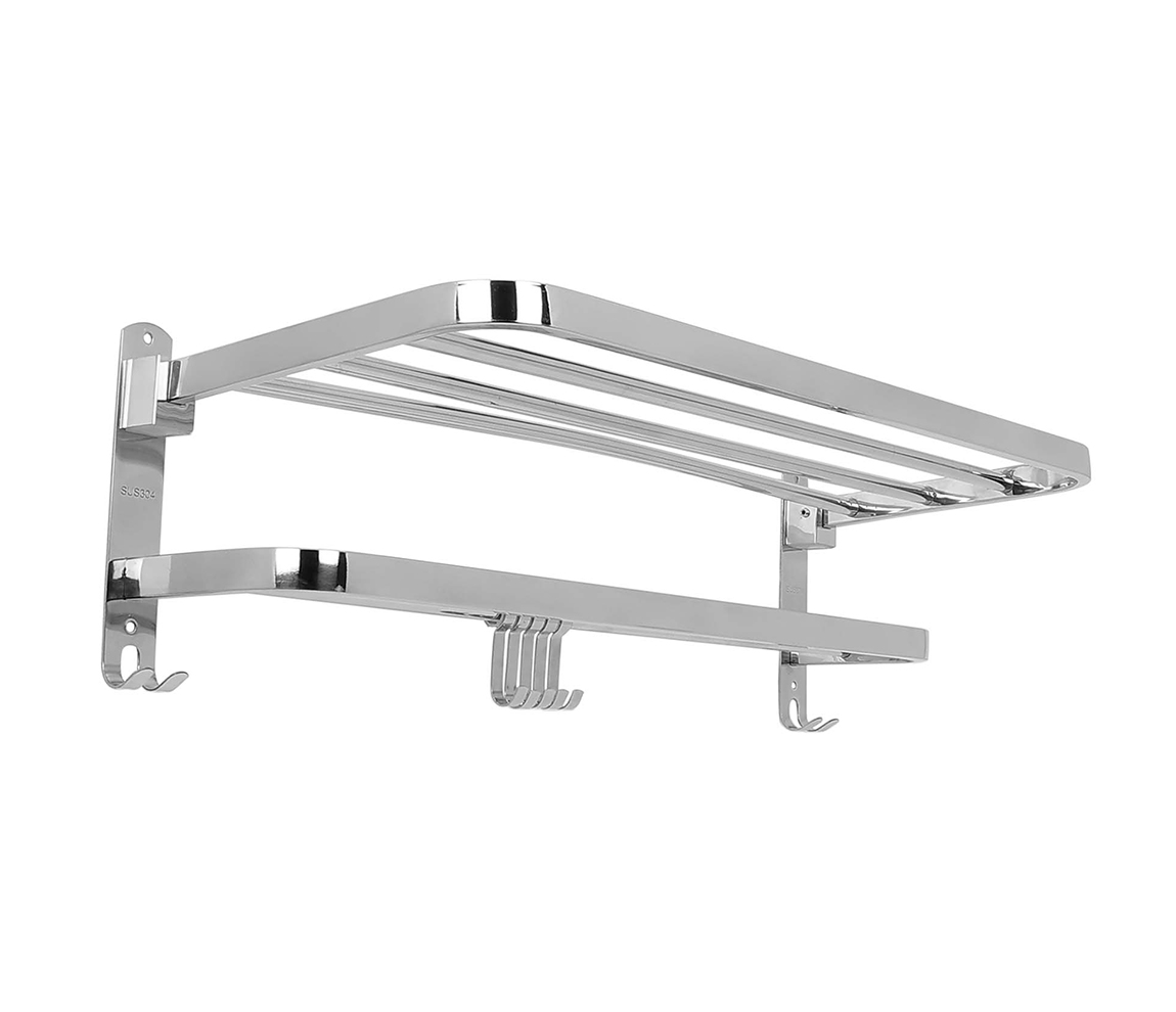Maximize bathroom space with Hindware Italian Collection Towel Shelf Foldable— a clean, practical rack that stores, airs, and keeps towels within easy reach. • Stainless Steel : Built to resist rust and humidity for everyday durability, finished in easy-clean chrome. • Foldable Upper Shelf : Space-saving design folds when not in use while providing ample room for stacked towels. • Multi-Bar Convenience : Multiple rails let you hang and dry different towel sizes at once for better airflow. • Simple Installation : Standard wall mounting with a compact footprint (approx. 60 × 24 × 22 cm) fits most bathrooms.